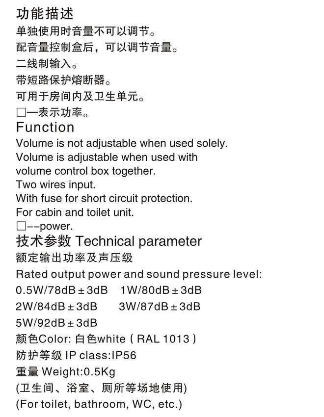 | 功率: | 5W | 聲壓等級: | 92dB |