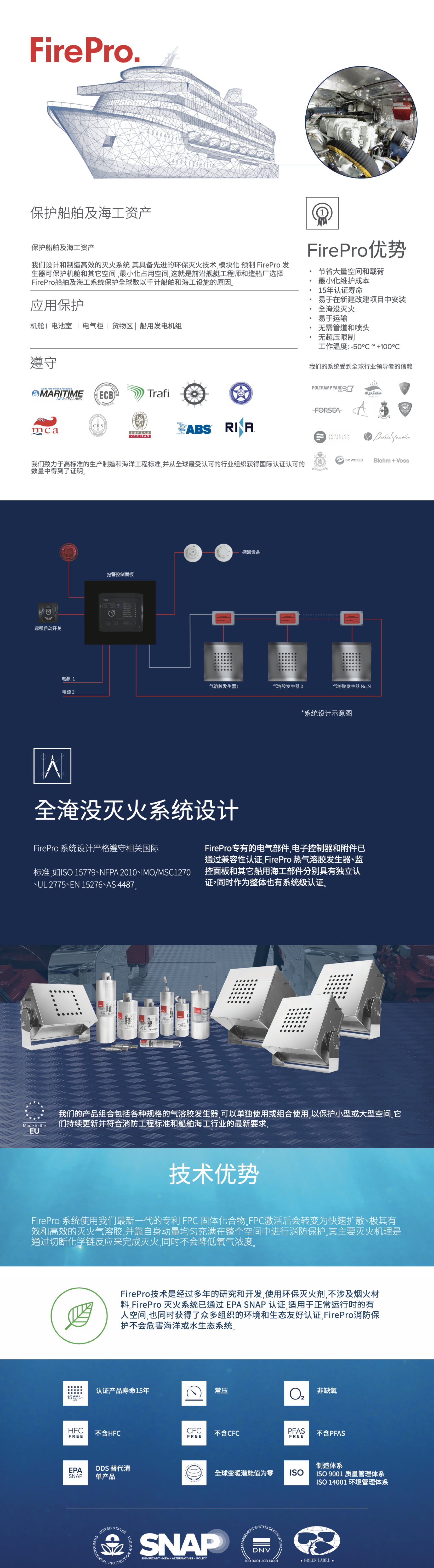 | 標準: | ISO 15779;NFPA 2010;IMO/MSC1270;UL 2775;EN 15276;AS 4487 | 性能特點: | 無需管道與噴頭;節省空間與載荷;環保無害;維持空間氧氣濃度;無超壓限制;15年認證壽命;維護成本低;新造船與改造船均可用 |